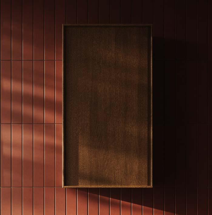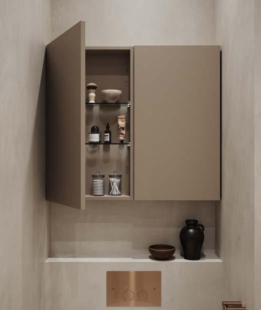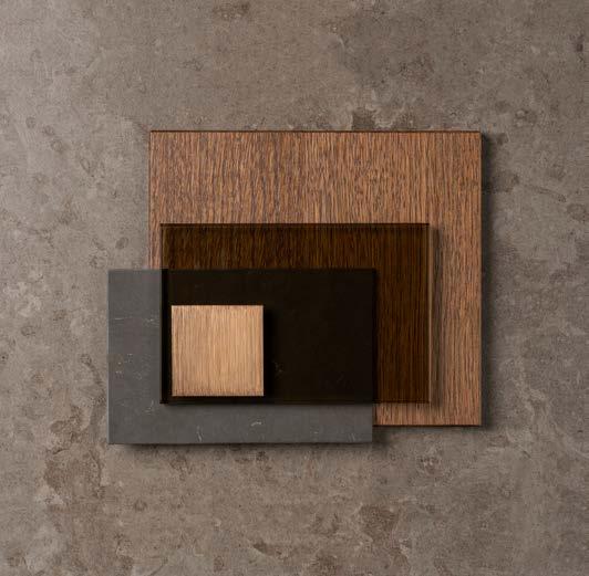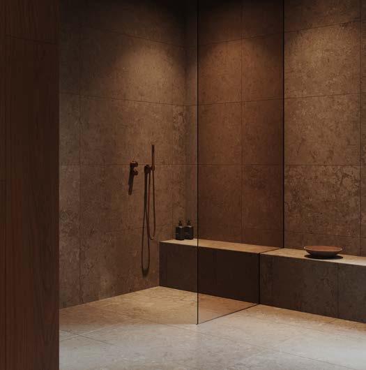 En varm och balanserad palett där jordnära toner, mörk ek och kalksten i bruna nyanser möts i ett mjukt samspel. Brons och borstade metaller tillför tyngd och taktil elegans och formar ett badrum med inbjudande värme och jordnära lyx.