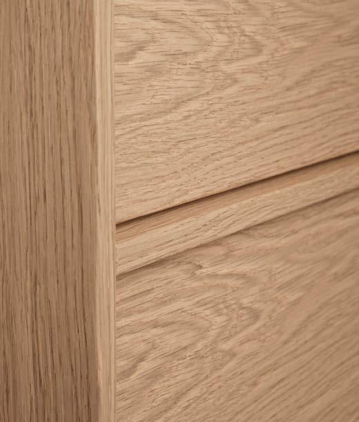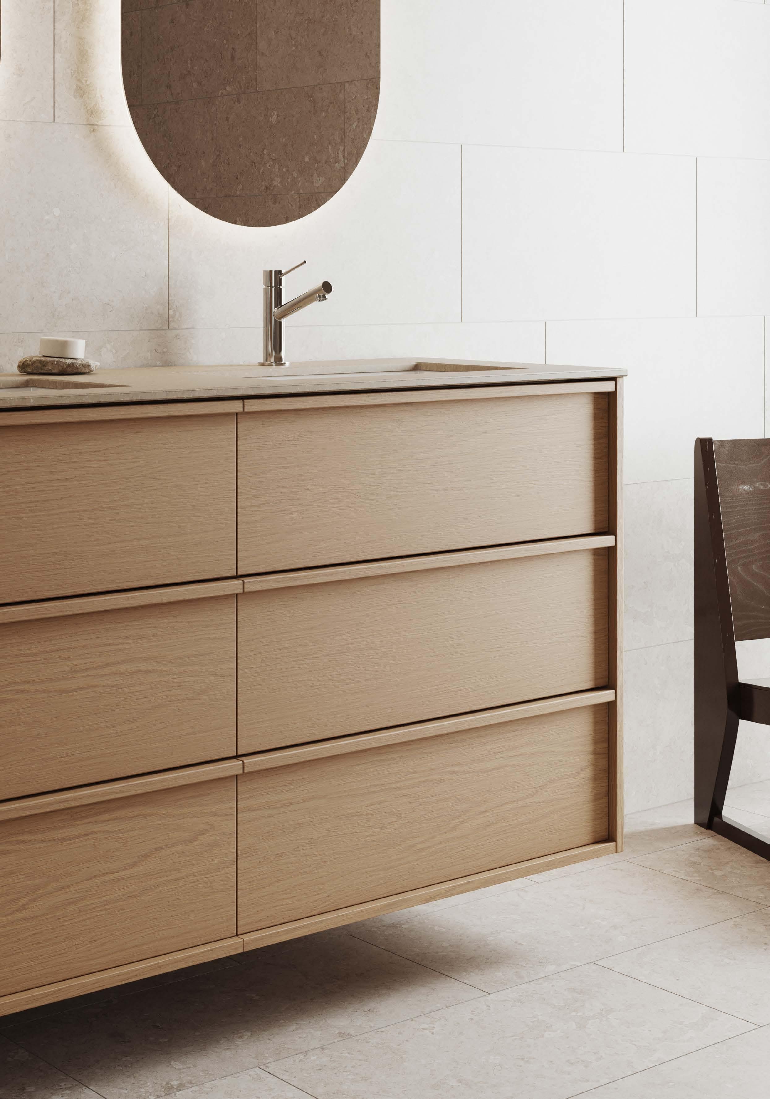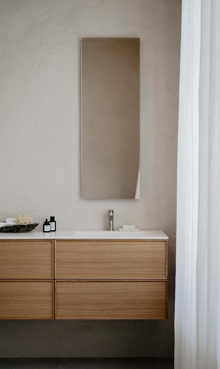 En luftig palett i ljus ek och kalksten, kompletterad av taktila kontraster i borstat rostfritt stål och räfflat glas. Modern enkelhet med jordnära värme – ett badrum för dig som söker ljus, stillhet och självklar harmoni.