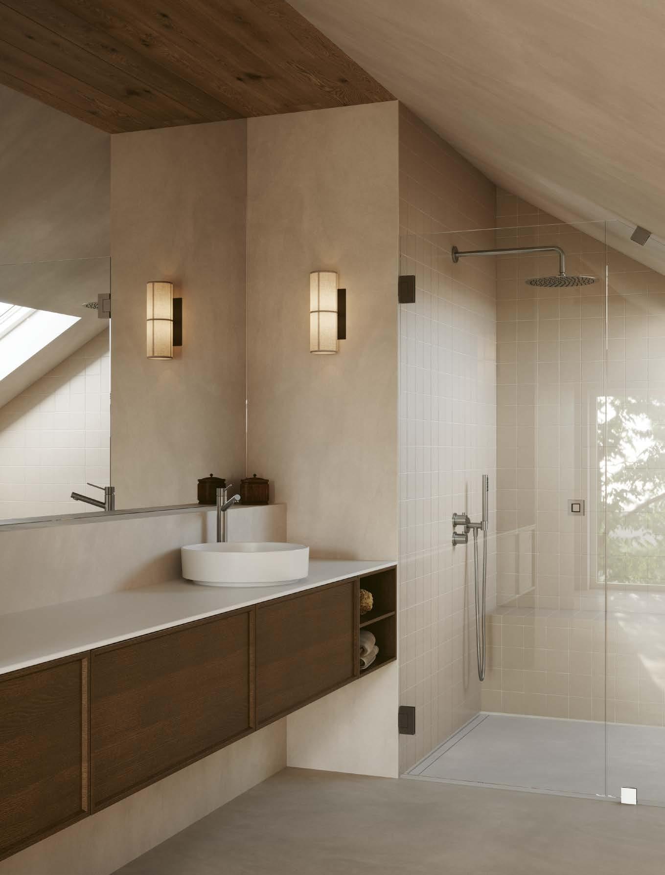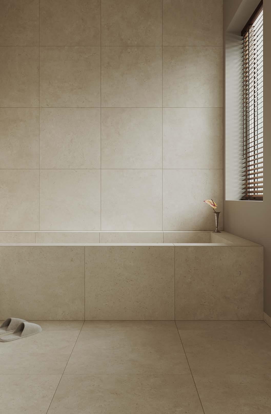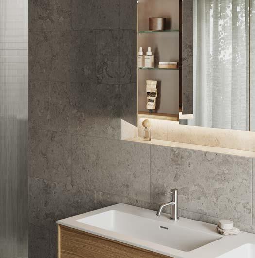 Låt granitkeramik lägga grunden till ditt personliga badrum – med kvalitet och karaktär, inspirerad av nordisk kalksten. Plattorna passar lika bra på golv som på vägg och finns i flera mönster, nyanser och storlekar. De är både slitstarka och hållbara – en tidlös bas att bygga vidare på. Utgå gärna från ett av våra Moods på sidan 18 och framåt, för att hitta en färg- och materialpalett som håller ihop helheten.