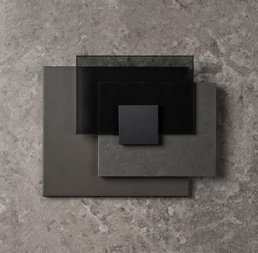 En sval palett av granitkeramik med öländsk kalkstenskänsla, rökfärgat glas och mattsvarta metaller. Tillsammans formar de ett rum där nordisk stillhet möter rogivande japanska undertoner – en dimgrå harmoni som dröjer sig kvar.