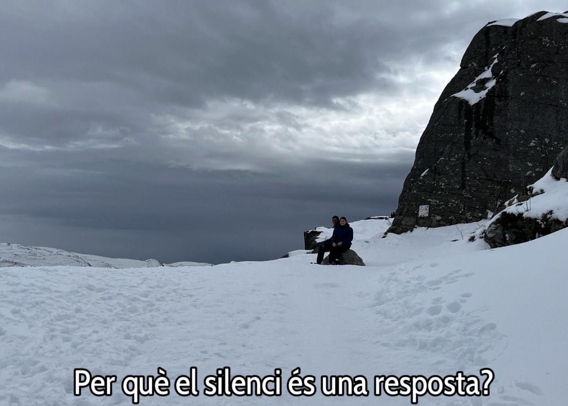 La fotografia ens mostra un paisatge de muntanya nevat, el cel fosc, la presència de dues persones transmet una sensació de soledat. A vegades, un silenci és una no resposta verbal, però és una resposta molt clara. Hi ha moments en el silenci que és quan tot se sent més clar i ressona.