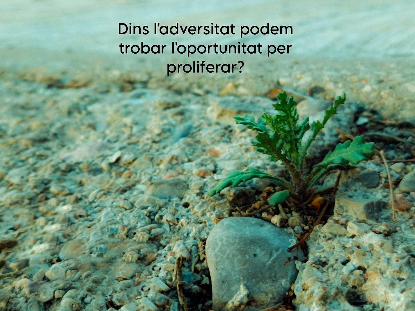 La fotografia ens mostra una planta que malgrat estar envoltada de roques i pedres, és capaç de tirar endavant i créixer forta. Podem fer i ser com aquesta planta i, seguir endavant malgrat l'adversitat?