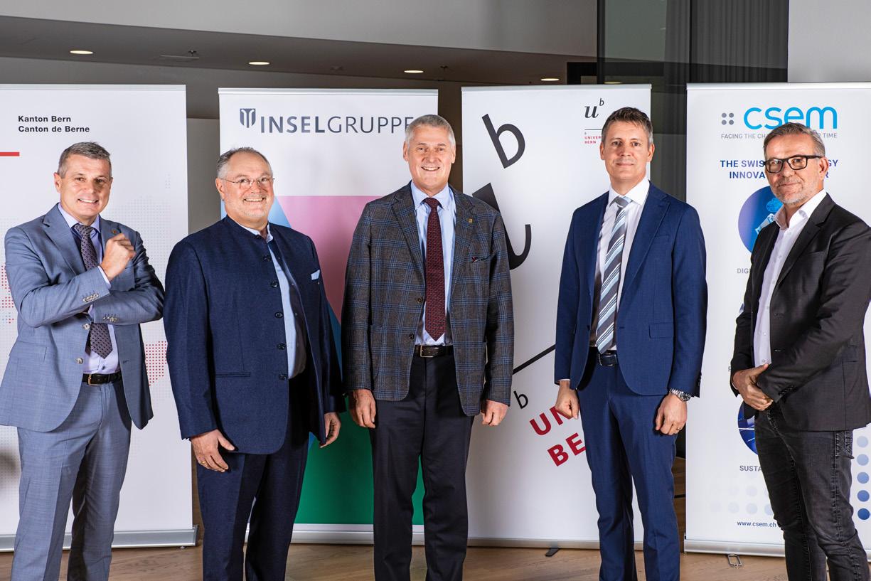 V. l. n. r.: Christoph Ammann, Regierungsrat, Vorsteher der Wirtschafts-, Energie- und Umweltdirektion Kanton Bern; Uwe E. Jocham, Direktionspräsident Insel Gruppe; Christian Leumann, Rektor Universität Bern; Alexandre Pauchard, CEO CSEM; Jens Krauss, VP Systems CSEM