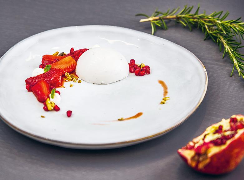 2. Panna cotta aus den Silikonformen stürzen oder im Glas lassen. Mit den Erdbeeren, Granatapfelkernen und (Nuri-) Knuspermüsli servieren. (Für die Variante mit Gelatine alle Zutaten bis auf die Gelatine aufkochen. Gelatine beigeben und glattrühren.)