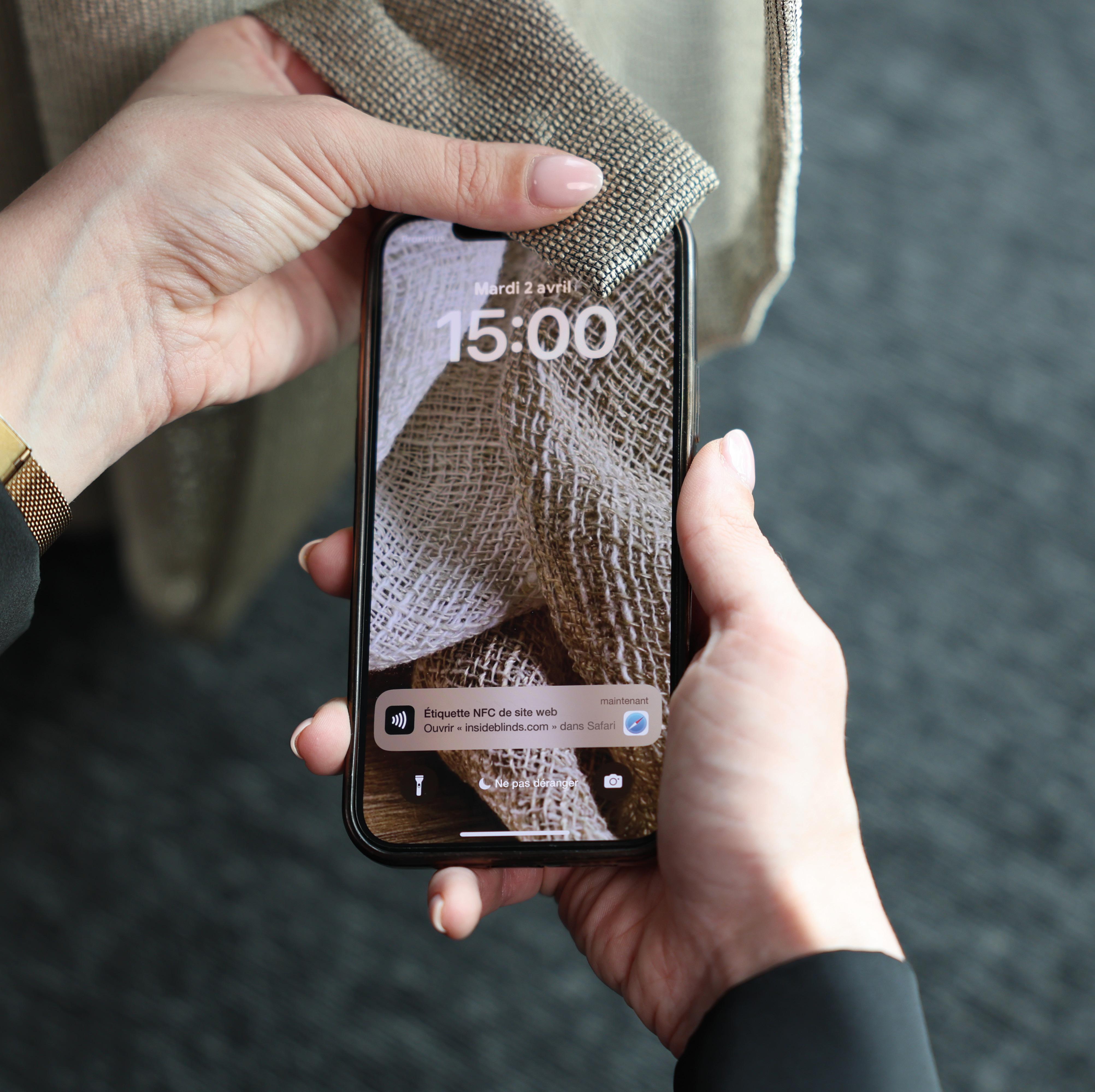 Inside fini est équipé d’une puce NFC. Cela permet à votre client de scanner ses rideaux avec son smartphone pour obtenir des informations détaillées sur le produit.