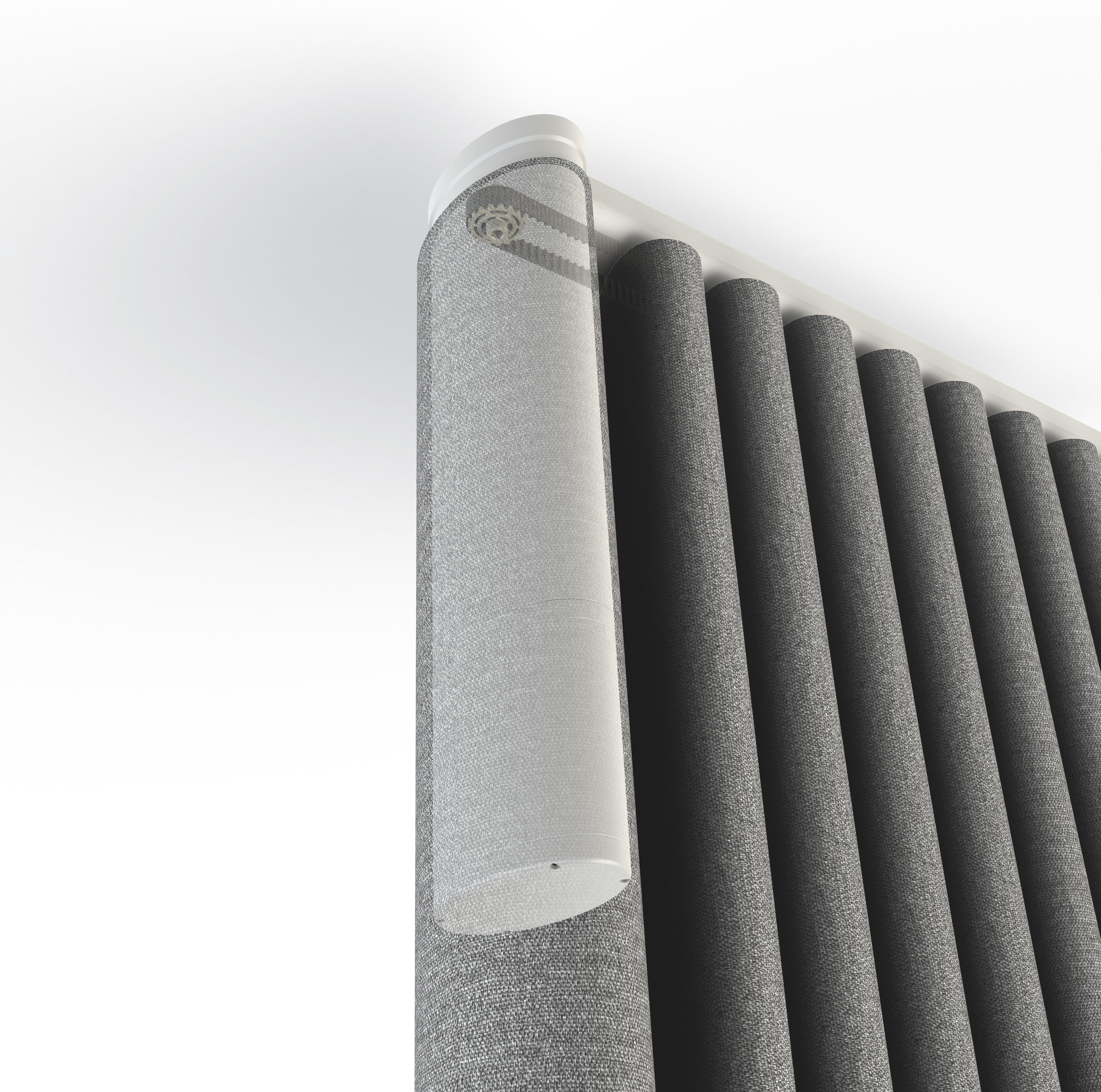 Pour le pli wave motorisé, nous avons développé un nouvel accessoire qui permet au rideau de tomber plus joliment. Cette nouvelle pièce consiste en un petit bras qui se fixe à la barre de retour du pli wave et permet à la dernière vague de se prolonger joliment jusqu’à l’arrière du rideau.