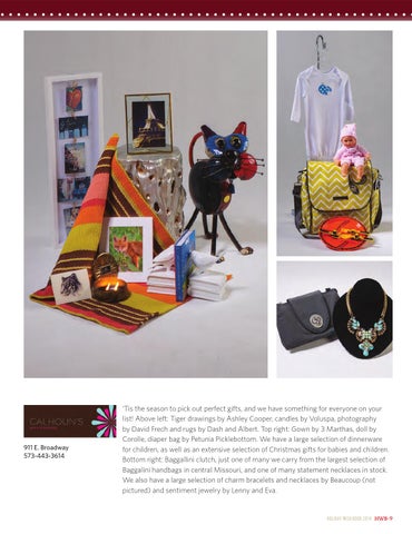 ‘Tis the season to pick out perfect gifts, and we have something for everyone on your list! Above left: Tiger drawings by Ashley Cooper, candles by Voluspa, photography by David Frech and rugs by Dash and Albert. Top right: Gown by 3 Marthas, doll by Corolle, diaper bag by Petunia Picklebottom. We have a large selection of dinnerware for children, as well as an extensive selection of Christmas gifts for babies and children. Bottom right: Baggallini clutch, just one of many we carry from the largest selection of Baggalini handbags in central Missouri, and one of many statement necklaces in stock. We also have a large selection of charm bracelets and necklaces by Beaucoup (not pictured) and sentiment jewelry by Lenny and Eva.