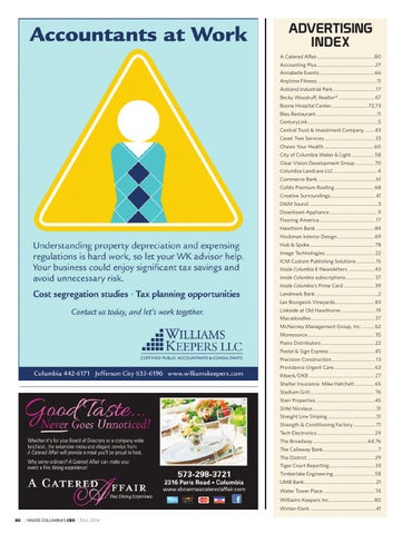 ADVERTISING INDEX A Catered Affair.................................................80 Accounting Plus................................................. 27 Annabelle Events...............................................66 Anytime Fitness...................................................11 Ashland Industrial Park.....................................17 Becky Woodruff, Realtor®............................... 67 Boone Hospital Center............................... 72,73 Bleu Restaurant....................................................11 CenturyLink............................................................5 Central Trust & Investment Company.........43 Cevet Tree Services........................................... 33 Chews Your Health...........................................60 City of Columbia Water & Light....................58 Clear Vision Development Group.................70 Columbia Landcare LLC..................................... 4 Commerce Bank.................................................61 CoMo Premium Roofing..................................68 Creative Surroundings.......................................41 D&M Sound...........................................................3 Downtown Appliance......................................... 9 Flooring America................................................17 Hawthorn Bank..................................................84 Hockman Interior Design................................69 Hub & Spoke....................................................... 78 Image Technologies.......................................... 22 ICM Custom Publishing Solutions.................15 Inside Columbia E-Newsletters.......................43 Inside Columbia subscriptions......................... 37 Inside Columbia's Prime Card........................... 39 Landmark Bank.....................................................2 Les Bourgeois Vineyards................................. 83 Linkside at Old Hawthorne..............................19 Macadoodles...................................................... 37 McNerney Management Group, Inc............62 Moresource......................................................... 35 Piano Distributors............................................. 22 Postal & Sign Express.......................................45 Precision Construction...................................... 13 Providence Urgent Care................................... 63 Riback/DKB........................................................ 27 Shelter Insurance: Mike Hatchett.................65 Stadium Grill....................................................... 76 Starr Properties..................................................45 Stifel Nicolaus..................................................... 31 Straight Line Striping......................................... 31 Strength & Conditioning Factory....................71 Tech Electronics.................................................29 The Broadway...............................................64,76 The Callaway Bank...............................................7 The District.........................................................29 Tiger Court Reporting....................................... 33 Timberlake Engineering...................................58 UMB Bank............................................................21 Water Tower Place............................................ 74 Williams-Keepers Inc.......................................80 Winter-Dent........................................................41 80