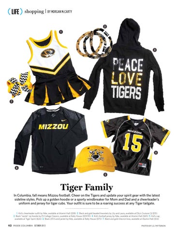 Tiger Family In Columbia, fall means Mizzou football. Cheer on the Tigers and update your spirit gear with the latest sideline styles. Pick up a golden hoodie or a sporty windbreaker for Mom and Dad and a cheerleader’s uniform and jersey for tiger cubs. Your outfit is sure to be a roaring success at any Tiger tailgate. 1. Kid’s cheerleader outfit by Nike, available at Alumni Hall ($38) 2. Black and gold beaded bracelets by Lily and Laura, available at Elly’s Couture (3/$35) 3. Black “razzle” zip hoodie by E5 College Classics, available at Rally House ($59.95) 4. Kid’s football jersey by Nike, available at Alumni Hall ($45) 5. Kid’s cap, available at Tiger Spirit ($24) 6. Black 2013 wind jacket by Nike, available at Rally House ($75) 7. Black and gold chevron bow, available at Alumni Hall ($14)