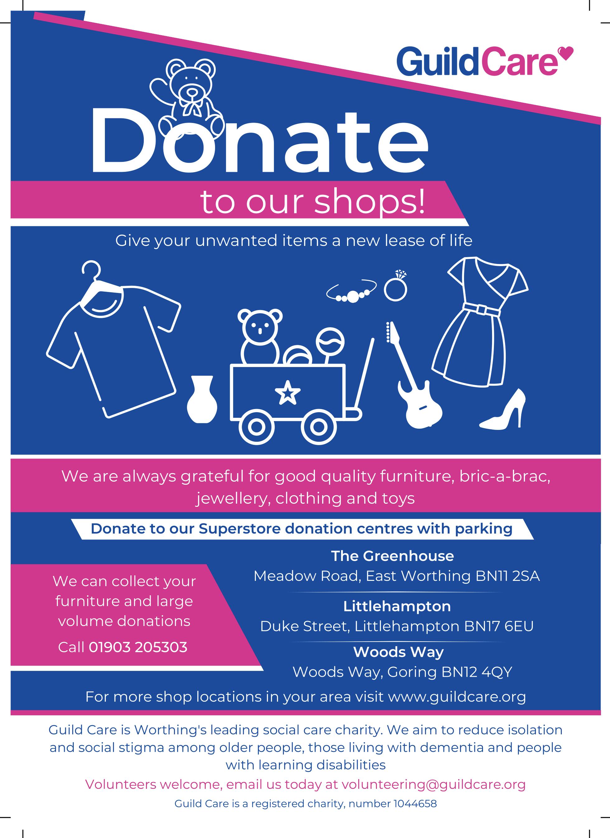 Guild Care is Worthing’s leading social care charity. We aim to reduce isolation and social stigma among older people, those living with dementia and people with learning disabilities Volunteers welcome, email us today at volunteering@guildcare.org Guild Care is a registered charity, number 1044658 For more shop locations in your area visit www.guildcare.org Littlehampton Duke Street, Littlehampton BN17 6EU Woods Way Woods Way, Goring BN12 4QY The Greenhouse Meadow Road, East Worthing BN11 2SA Give your unwanted items a new lease of life Donate We are always grateful for good quality furniture, bric-a-brac, jewellery, clothing and toys We can collect your furniture and large volume donations Call 01903 205303 Donate to our Superstore donation centres with parking to our shops!