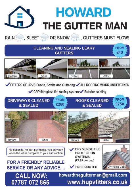 68 & BUILDING • New roofs • Flat roofs • Rubber Roofing • uPVC fascia boards • Chimney work • Slate Tiling • Guttering, Soffts & cladding • Gutters cleaned • Repointing • Dry verge • Dry ridge systems • Repair work • Flashing www.bossroofingandbuilding.co.uk info@bossroofingandbuilding.co.uk All your Roofing & Building needs INSURED FULLY & guaranteed 100% Positive feedback on Telephone 01244 456953 Mobile 07785 981111