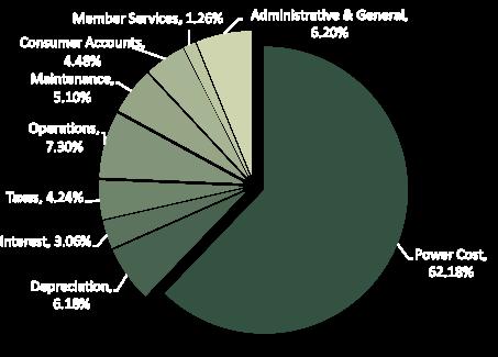 This graph provides a breakdown of our expenses by category and percentage. As you can see, the greatest expense incurred by your cooperative is purchased power. Power cost accounts for 62 percent of our expenses.