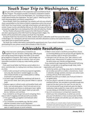• Make it more social in real life by joining fitness classes or searching Meetup.com for groups that get together for fitness activities, both in the gym and outdoors. • If the gym truly isn’t for you, quit. Take a dance or selfdefense class, riding lessons or outdoor survival course. Do what moves you, literally and figuratively. If you resolved to get organized but find yourself still living in clutter, running late or not getting enough sleep, tackle organization with small tasks. • Section by section, put things away, dust or disinfect and do not allow yourself to re-clutter a cleaned area. Invest in attractive storage solutions and clean one section each evening until you finish every section. • Decide if you pick up an object, you must put it down in its rightful place. • Use your phone’s calendar to track every appointment and block off time. Set reminders to provide enough time to get out the door and on the road. You can also use it to remind yourself to go to bed early, give the dog its medication, bake cookies for a bake sale or spend a few minutes tidying at 2251200 the end of each day. • Say no to unnecessary or unimportant requests that stretch your time and patience, to which you cannot give your full attention or that sound just plain terrible. Prioritize the people and activities you care about most, including yourself. Allison Goldberg writes and edits employee benefits-related materials for the Insurance and Financial Services Dept. of the National Rural Electric Cooperative Association, the Arlington, Va.-based service arm of the nation’s 900-plus consumer-owned, not-for-profit electric cooperatives.