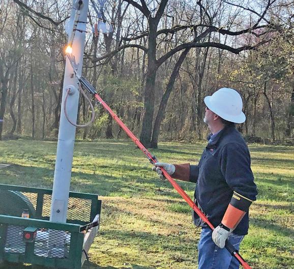 Waltrip, NAEC’s safety/training coordinator, demonstrates the danger of contacting energized lines for Cherokee Village Fire Department on March 29.