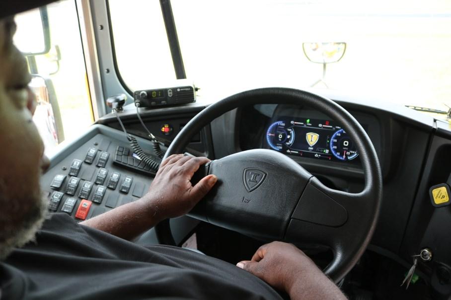 The only indication the bus is on is a green light icon on the dash. There is no sound of a rumbling motor or the typical smell of diesel. Easing on to the road for a short test ride, there is a low-level hum emanating from a noise generator that can be heard as long as the bus is traveling 20 miles per hour or less. “The noise generator is a national safety measure,” explains Dustin Marshall, Regional Bus Sales Representative with Rush Bus Center, Charlton County’s bus vendor. “The buses are very quiet and can sneak up on you, so the noise generator makes you aware of the bus’s presence.”