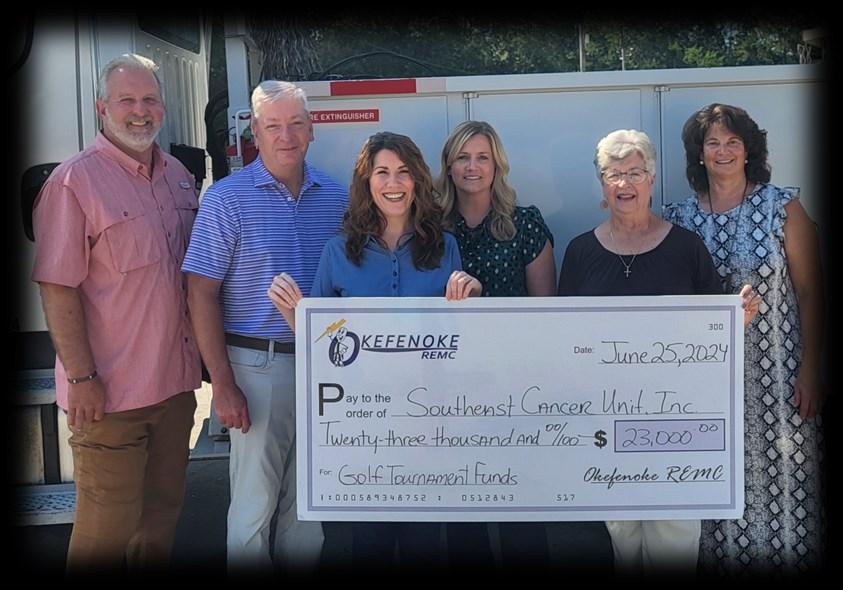 Just six months after hosting its 2023 Golf Tournament and donating a recordbreaking $25,000 to the Southeast Cancer Unit, Inc., OREMC moved the annual event back to spring and held its 2024 Golf Tournament in April. The tournament raised another $23,000 for the Southeast Cancer Unit. These funds will directly benefit cancer patients undergoing treatment in Brantley, Pierce and Ware counties with medical and travel expenses related to their care.