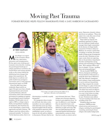 power. Depression, domestic violence and divorce are epidemic. “Those who make it do so only after years of trial and tribulation,” says Koga. Koga ended up using his own immigrant experience to change the way California’s health system manages these fragile communities. As the director of refugee health research for UC Davis’s School of Medicine, he oversees a system that is tracking, in real time, the mental health of large groups of immigrants across the state. Physicians at nine major county clinics are capturing data on the prevalence of psychiatric disorders and disparities among patients and transmitting it to Koga’s team. “We’re getting a GPS on the lives of refugees,” he says, “profiling them and seeing pathologies.” He also founded VIRTIS, the Veteran, Immigrant and Refugee Trauma Institute of Sacramento, a nonprofit whose logo is Odysseus’s ship. Like Odysseus, immigrants must undergo a huge transformation to survive and move beyond their pasts. Koga compares the recently arrived refugee to a glass of wine into which poison has been introduced: “No matter how much you dilute it, you won’t get the poison out. There is no way to heal unless you adopt a completely different paradigm,” he says. Treatment must address “not just wounding of the brain, but wounding of the soul.” Funded by Koga and other volunteers, VIRTIS provides critical services and resources to refugees, including free psychological counseling, mentoring by former refugees with similar backgrounds, HEROES page 33