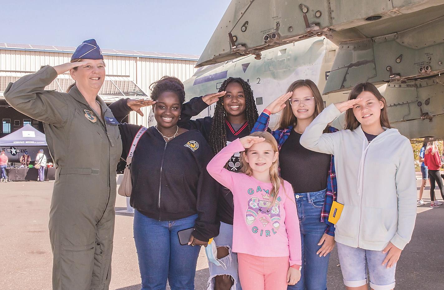 1. Career day at the Aerospace Museum of California encourages STEM studies for young women. Desert Storm veteran pilot Captain Cathy Cook (left) inspires visitors to seek aviation careers.