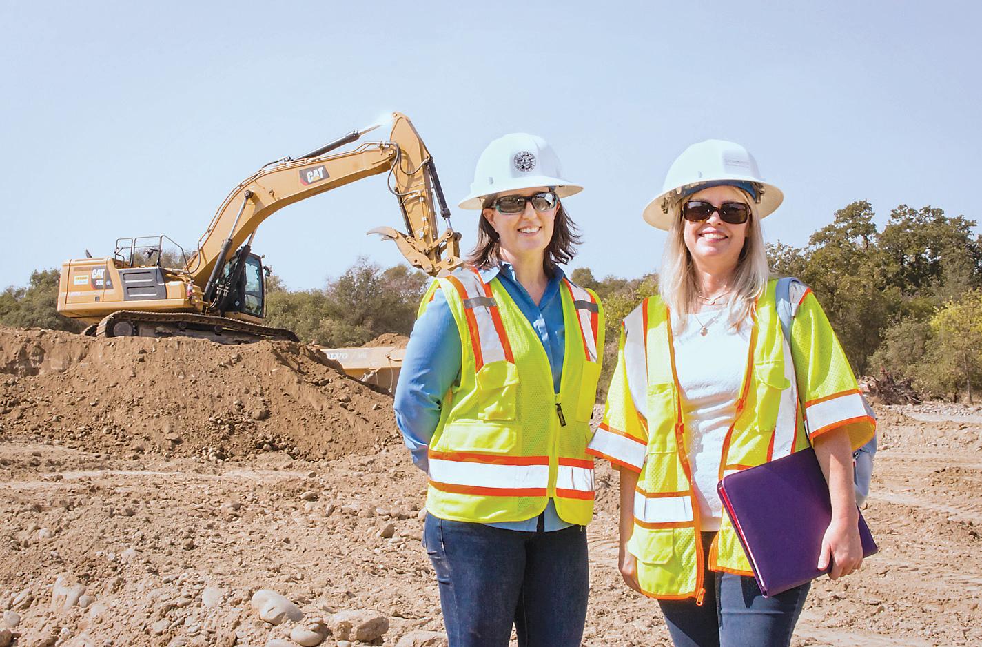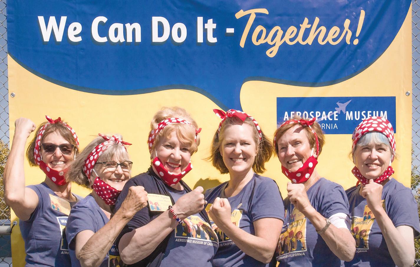 3. Aerospace Museum of California docents adopt Rosie-the-Riveter attire. Volunteers include (from left) Sharon Ruffner, Margaret Rogers, Linda Martin, Heidi Sanborn, Donna Miller and Sue Boucher. 4. Water Forum Program Manager Erica Bishop (left) and media officer Christine Kohn inspect a Bureau of Reclamation project to restore American River salmon habitat near Ancil Hoffman Park.