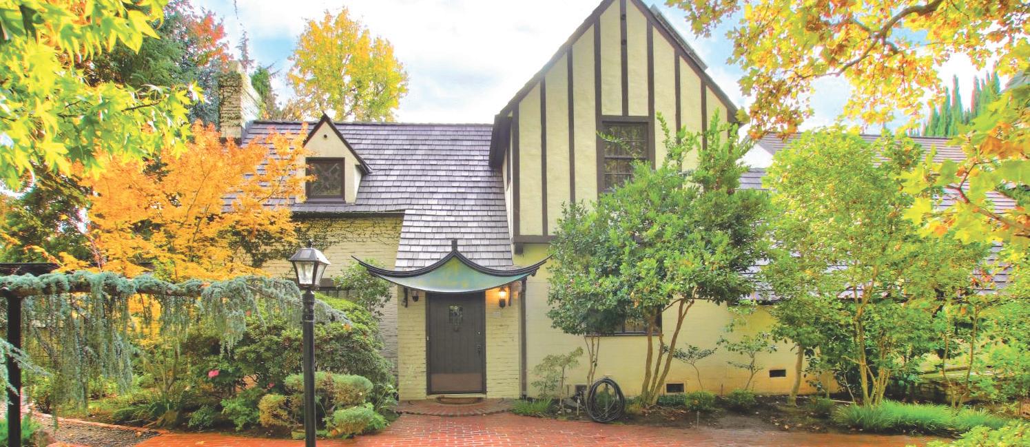 4 beds 3½ baths. Tudor style with beamed ceilings, spacious primary suite, sitting room, yoga room, secret garden