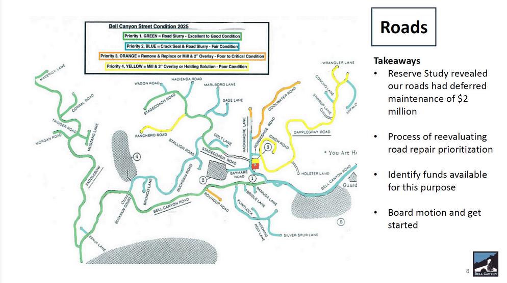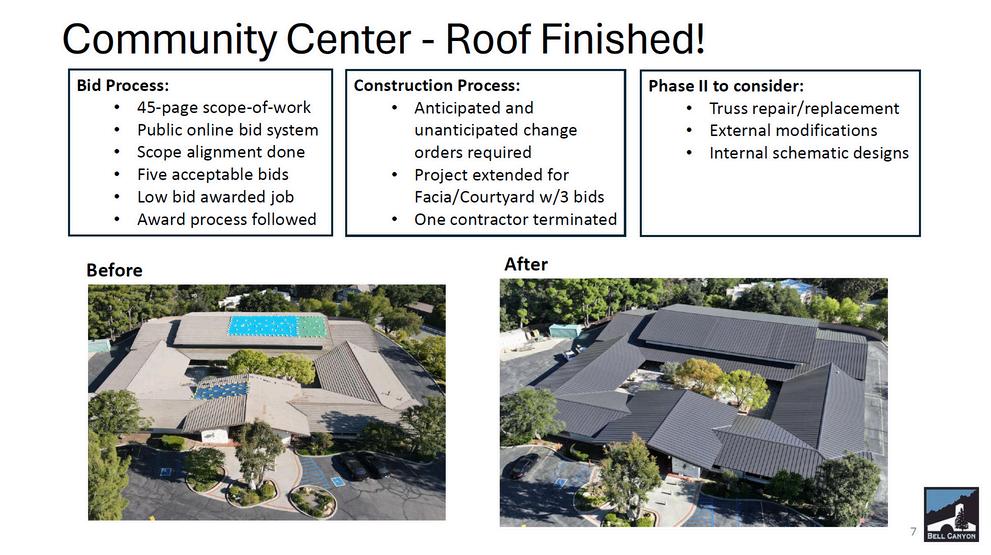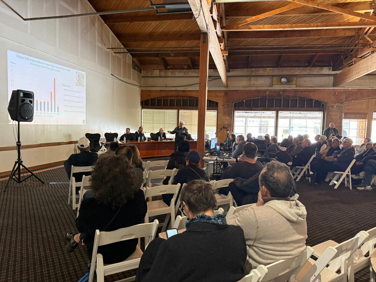 March 30 , the first gathering, State of the Canyon, was a landmark event that drew a good crowd to the long-overlooked Social Hall. Held in the heart of the community, the meeting highlighted the challenges the current board inherited, including years of deferred maintenance, limited financial reserves, and unaddressed structural issues of the BCCC with issues dating back to the 1994 Northridge earthquake. A comprehensive slide presentation walked residents through the community’s fiscal history, current priorities, and a forwardlooking plan. Graphs and financial summaries made the complex issues more accessible, and attendees were able to enjoy coffee and snacks as they engaged in thoughtful discussion. The event took place inside the very building now undergoing revitalization, where a new roof has recently been installed, and additional structural repairs are in the pipeline.