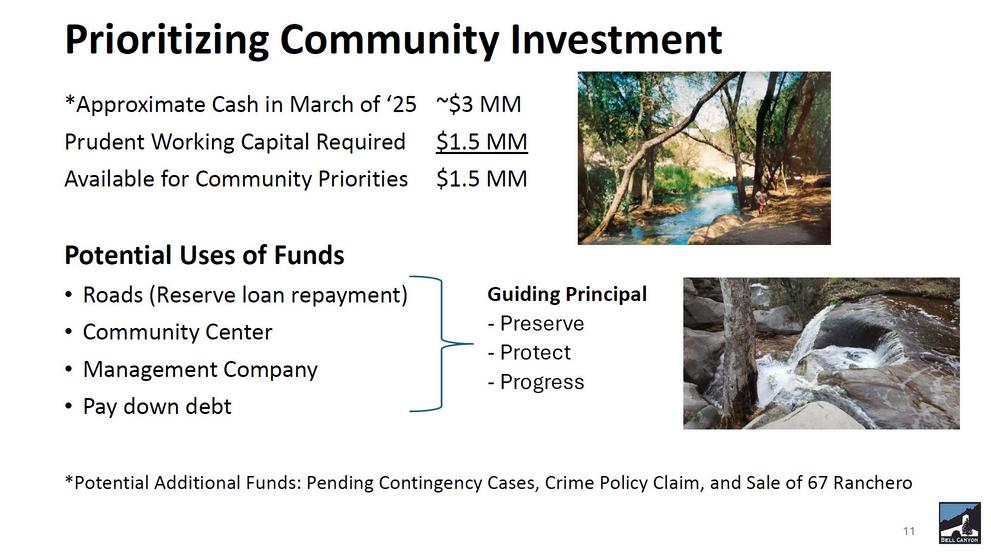 Some highlights and reflections from the current fiscal year include the successful replacement of the Community Center roof, long-overdue road repairs, and recapitalization efforts—most notably through the resolution of all 12 inherited lawsuits, recovering $900,000 from what was once considered a hopeless case, and the sale of a community-owned property.