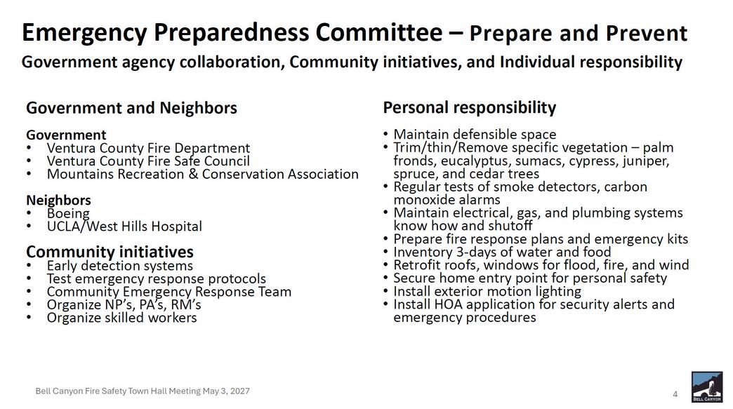 In 1986, recognizing the importance of civilian assistance in responding to emergencies such as fires and earthquakes, the LAFD began the CERT program Since that time, the program has evolved to what it is today Not only are CERT teams supported by local fire departments, but they are also a national program supported by FEMA There are CERT teams in all 50 states and in more than 3200 communities. There is currently a CERT team here in Bell Canyon, and to name a few, there are teams in Thousand Oaks, Simi Valley, and Ventura. After the recent fires, many communities are actively recruiting CERT members.