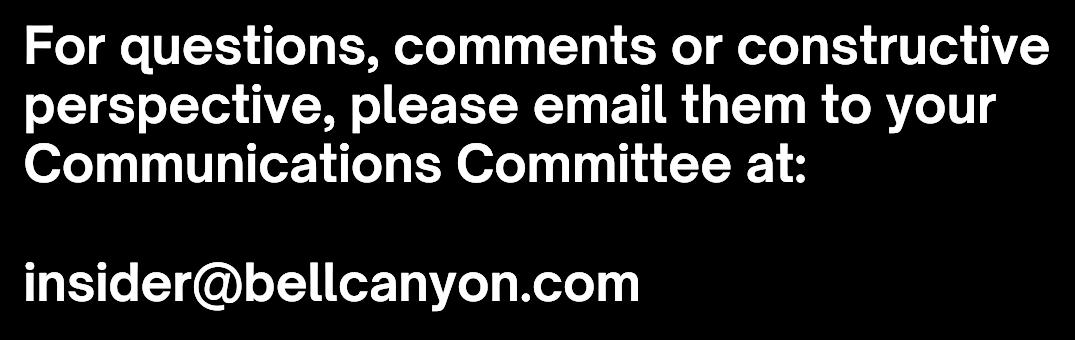 The year also saw the return of community events and movie nights, the hiring of a professional Community Management Company (Keystone), the formation of the Emergency Preparedness Committee, and the launch of this very publication—Insider, Bell Canyon’s new digital magazine.