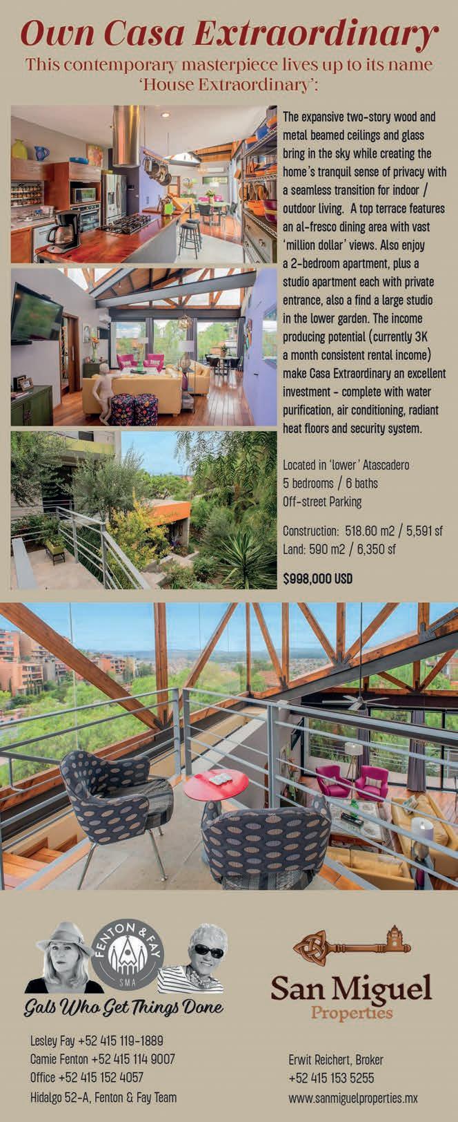 Food and Beverage: Isaac del Castillo is busy at work, what with rebranding his Spanish place (formely Aquí Castilla) at Jesus 5, now Zaki’s Mediterraneano. He is also expanding next door to his NY Style Deli, the Marketplace Restaurant - Opening to be announced. Hank’s, one of the busiest watering holes and consistently great dining experiences in ourto wn, recently celebrated their founder’s birthday in memoriam. Bob Theiman an iconic restaurantuer and developer in San Miguel, passed about one year ago. Hank’s (open every day and featuring a daily 2-for-1 happy hour from 5pm to 8pm) is running strong under the guidance of his widow Lisa and his only daughter, Amanda. A 'hidden gem' Agavia 115 restaurant on Hernández Macías 115, this creative and unique modern take on traditional Mexican food makes it a worthy visit. Local, organic dishes cater to meat lovers & vegetarians. Reservations are a must in this minuscule multilevel establishment: 52 415 1030933