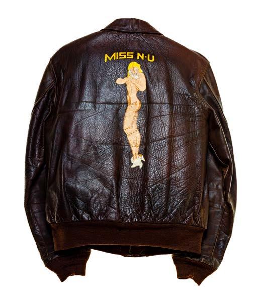 “Fancy Nancy” is an A-2 jacket that belonged SSG Wesley R. Sheehan. A friend hand carried the jacket from California to Oshkosh, Wisconsin, so it could be photographed for the book. The owners had it appraised and insured first, which was valued at $8,000. SSG Sheehan flew 50 combat missions, and survived two bailouts, signified by the two parachutes painted on the jacket.