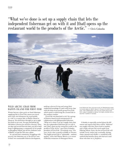 making a decent living and using their traditional knowledge to catch wild Arctic char with the help of non-profit group First Fish, which assists in delivering the coveted fish to the southern market. First Fish was launched in 2017 by a group of Ontario-based social entrepreneurs in collaboration with Qikiqtarjuak fishermen. “What we’ve done is set up a supply chain that lets the independent fisherman get on with it and [that] opens up the restaurant world to the products of the Arctic,” says Chris Colombo, president of First Fish. “Everybody wins.” For now, Arctic char is mostly available in Toronto. The highly prized fish is “unbeatable…sashimiquality,” notes chef Wayne Morris, a co-owner of Boralia restaurant on Ossington Street.
