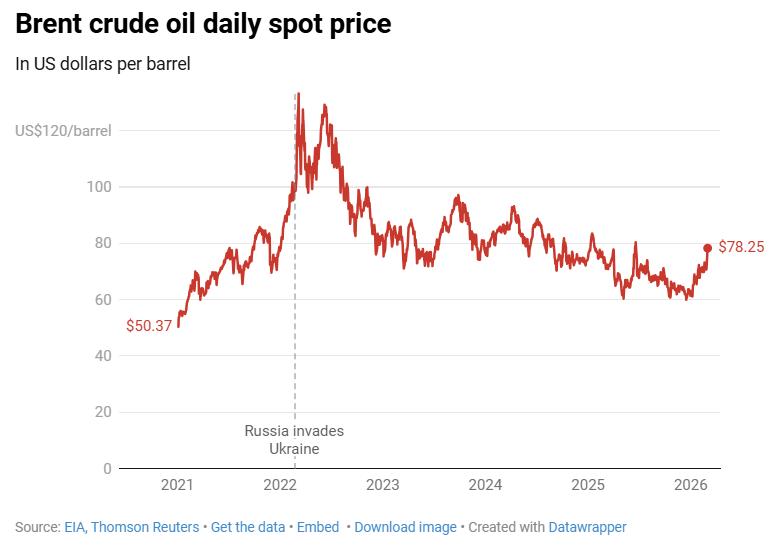 Gulf countries face particularly high risks because many depend heavily on imported food. In Qatar, for example, more than 90% of food is imported, with the vast majority arriving by sea. With flights not fully operating across the region, food availability could become a growing concern. Food by road freight from Turkey may provide an emergency alternative, but capacity would be limited and costs significantly higher than maritime transport. Beyond the region, consumer prices may also rise. Higher energy costs are likely to be a major driver, although the overall impact will depend on how long the crisis lasts and what happens to those energy prices in the meantime. Brent crude oil prices increased from about US$72 (£54) before the strikes began to around US$79