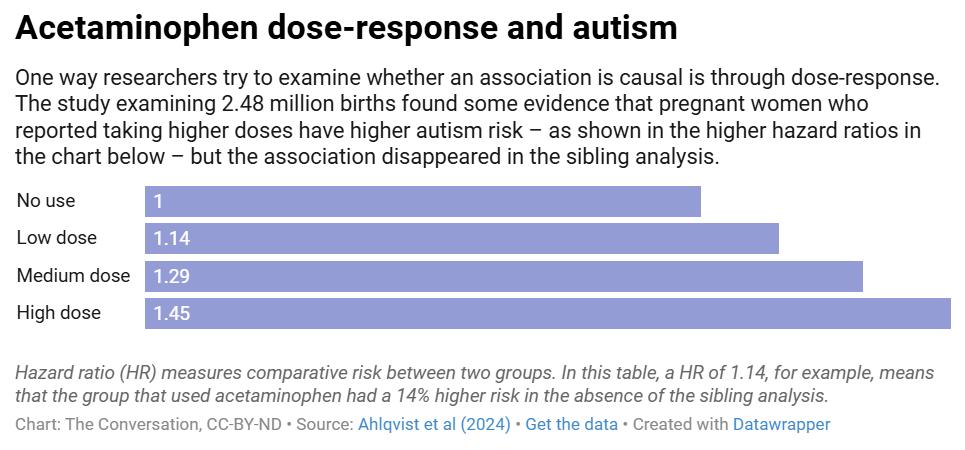 Another way to examine possible causality in this context is to analyze sibling outcomes, which that same paper did. Researchers looked at whether associations between acetaminophen and autism persisted within families with more than one child.