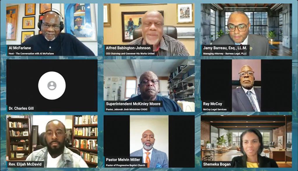 trends, this election is pivotal in determining policies on economic equity, criminal justice reform, healthcare, and education—issues disproportionately affecting Black and marginalized communities. Al McFarlane opened the conversation by emphasizing these stakes. “This election carries the weight of history,” McFarlane remarked, setting the stage for a candid discussion about faith, democracy, and political power. Reverend Alfred Babington Johnson, (Babington) a leading voice in the conversation, underscored the historical struggle for Black voting rights, from being counted as threefifths of a person to securing the right to vote through the 15th Amendment. “We cannot forget that our right to vote was hard-fought and hard-won,” Babington reminded listeners. Babington explained that His Works United, a coalition of African American churches, has been working tirelessly to mobilize voters through initiatives such as Souls to the Polls. “We’re not just getting people to vote—we’re engaging them in the process of building their future,” he said,