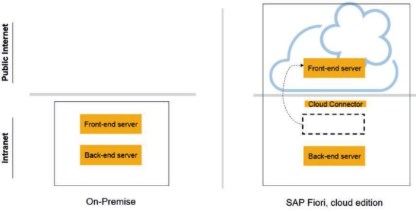 Toappreciatethesedifferences,consideratypicalwebapp builtonSAP’sSAPUI5framework(i.e.thetoolkitusedto createFioriapps).Ifthisappwasdevelopedon-premise, thebasiccomponentarchitecturewouldlooksomething likewhatyouseeontheleft-handsideofthefigurebelow Here,thefront-endserverisastandaloneinstanceofSAP Gatewayandtheback-endservermightbeSAPS/4HANA oranolderSAPBusinessSuitesystem.