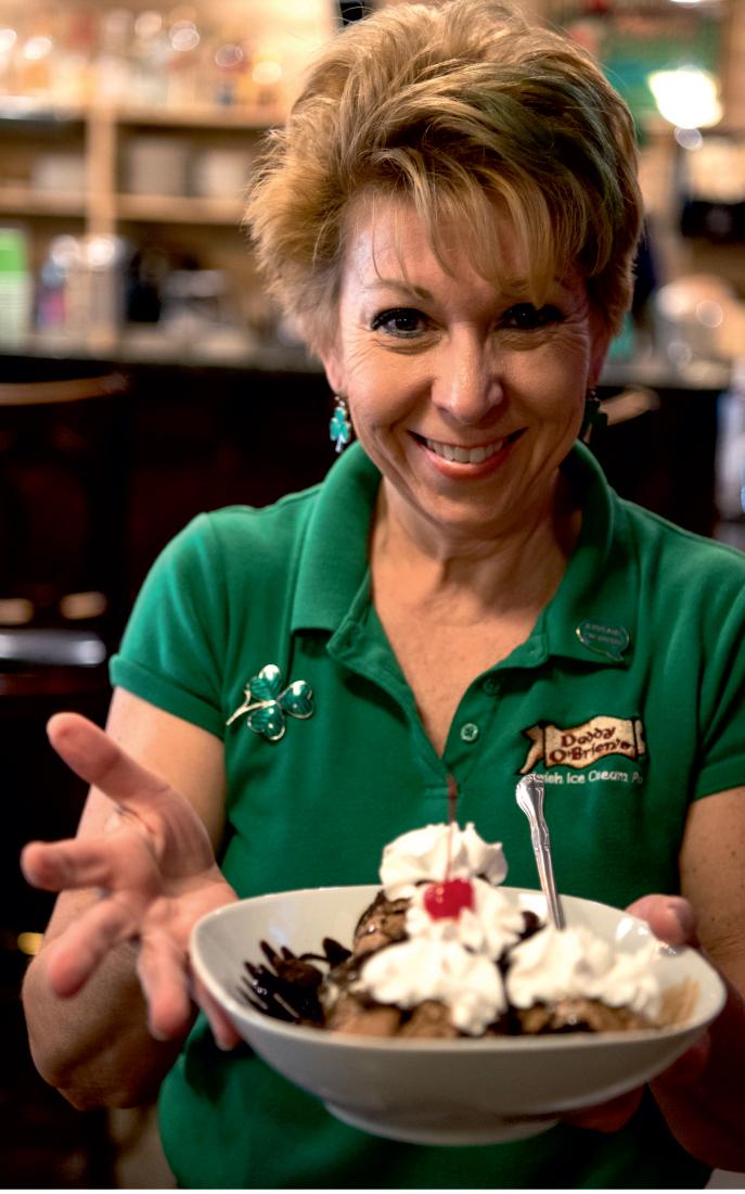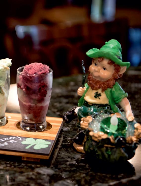 TheconceptofanIrishIceCreamPub wascreatedoutofthemindsofthis couplethathasbeentogethersince highschool,andistotallyunique. FrankO’Briendescribesthe atmosphereas,“To walk into our store is like walking into Ireland. It has a dark wood bar with stained glass windows, ornate black granite and bar ceiling, Jack Daniel whiskey barrel hi-tops, Church pews for booths, deep red and green walls, a stone fireplace and curtains on the windows. It has a magical and homely feeling with