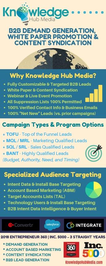 TheofferingsofKnowledgeHubMediaarediversebytheir verynature.Itscorecompetenciesfallintheareasor demandgenerationandcontentsyndication.Itoffers multipleengagementopportunitiesforitsclientsto effectivelyreachtheirtargetaudience(s)throughhigh impactonlineadvertising,contentsyndicationanddemand generationprograms.Itpromotesitsclients’whitepapers andwebinarstogenerateanddeliverhighlytargeted,highly qualifiedB2Bsalesleads.Aseachofitsclientshave differentproducts,solutions,andservices,theytarget differentsegmentsofpeople(andcompanies).Itsofferings arecustomized,fullytailoredtotargetfolkswithintheright jobroles–attherightcompanies–whoaretypically alreadyinthebuyingcycleforitsclients’solutions.