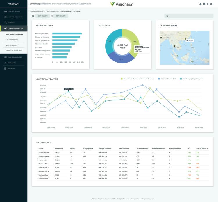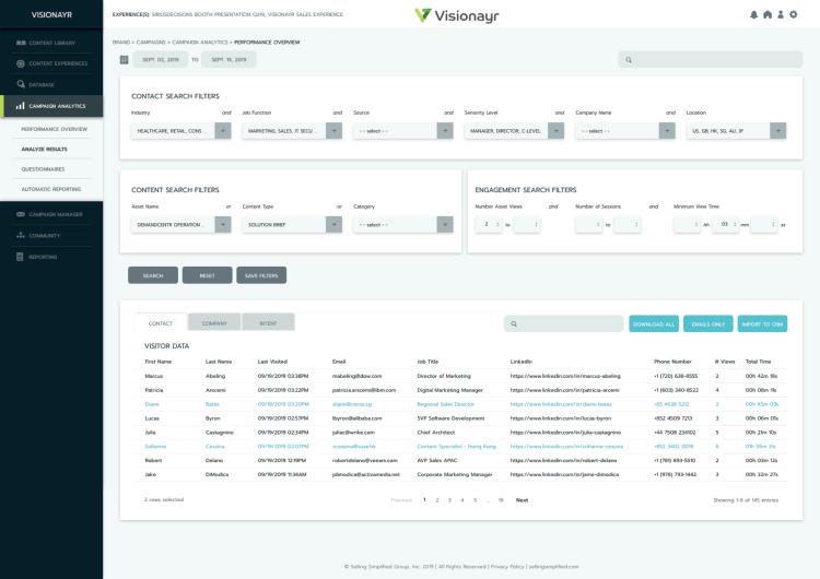 Visionayr,thecompletemarketingsolutionfromSelling Simplified,wasdesignedtogiveB2Bmarketersareal-time viewoforganicdemandandintentsurroundingtheir productsandcustomers.BackedbySSG’srobustglobal data,Visionayrallowsuserstohostandpromotemultiple piecesoftheircontentinacentralizedbrandedhub,and traceengagementanalyticsbacktokeyaccountsand prospectsatahighlycompetitivecostperlead.