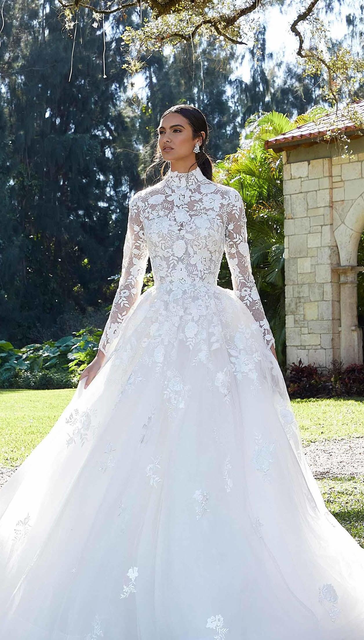 Current trends in wedding dresses are quite varied but sleeves are back in fashion as are higher neck lines and some glitter of course.