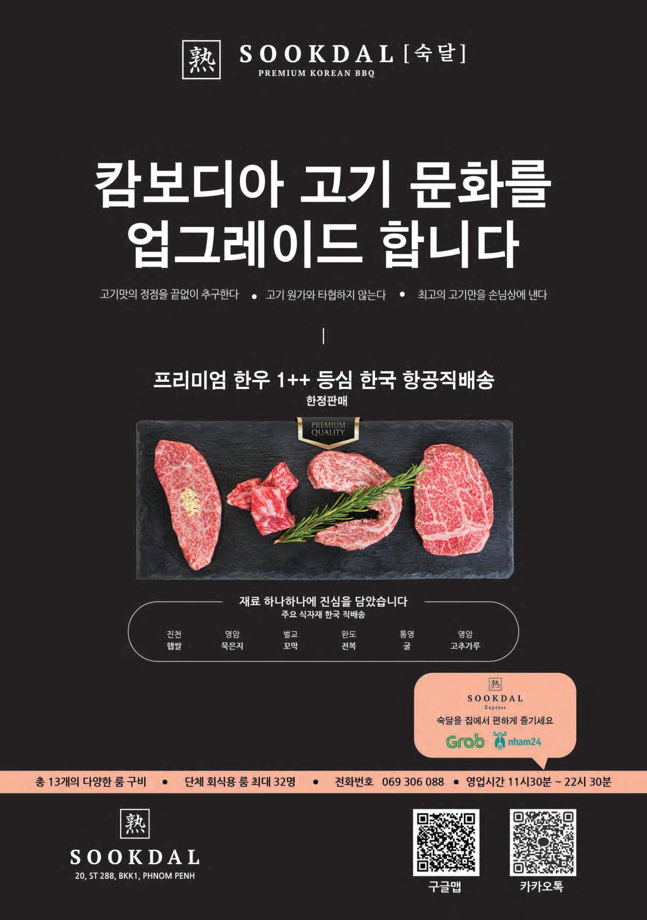 연중무휴 Phu Quoc branch: Sonasea Villas and Resort tourist complex, Duong Bao hamlet, Duong To, Phu Quoc, Vietnam Phnom Penh branch: No. 231 Corner of Street. 352 and 63, Boeung Keng Kang1, Phnom Penh, Cambodia 011 238 933 (Korea) 015 288 977 (English, Khmer) 11am ~ 22pm
