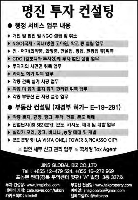 한국어 <> 영어 <> 캄보디아어 통번역 서비스 캄보디아 정부 관계 부처 안내 부동산 권원조사, 실사, 등기 이전 등 인허가 대행 담당자 : 박 경 호