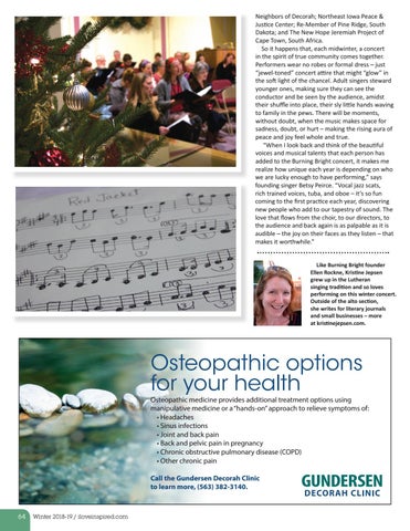 Osteopathic medicine provides additional treatment options using manipulative medicine or a “hands-on” approach to relieve symptoms of: • Headaches • Sinus infections • Joint and back pain • Back and pelvic pain in pregnancy • Chronic obstructive pulmonary disease (COPD) • Other chronic pain Call the Gundersen Decorah Clinic to learn more, (563) 382-3140.