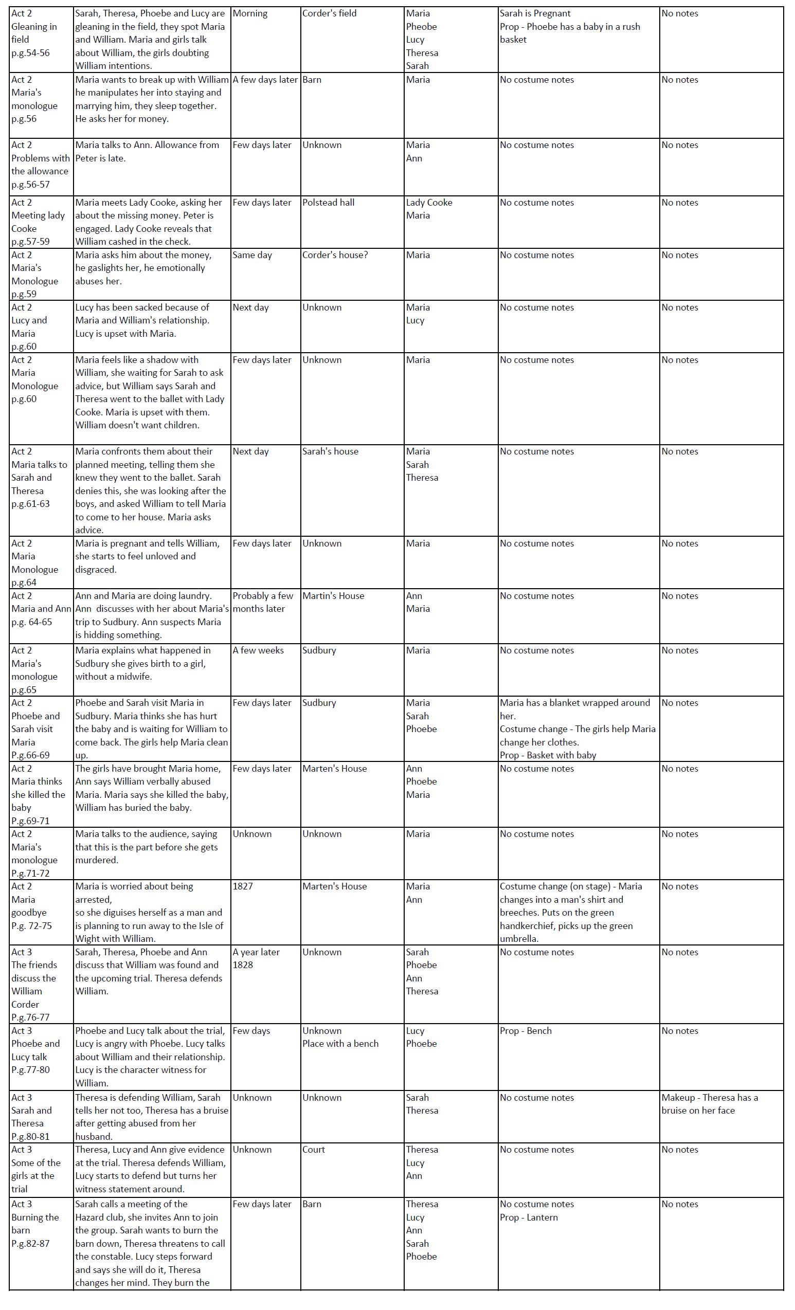 Beth Flintoff (2021) describes the story in her introduction as an ‘un-murdering’. When researching this story, she discovered the barn had burned down, which led her ask, ‘what if the women that loved Maria were not afraid, subdued or anxious, but were instead very, very angry’. The way she wrote the play was influenced by her meeting with a group of women who experienced domestic violence or abuse. She did not want to focus on the violence so decided to cut William out, but instead made it about love and friendship.