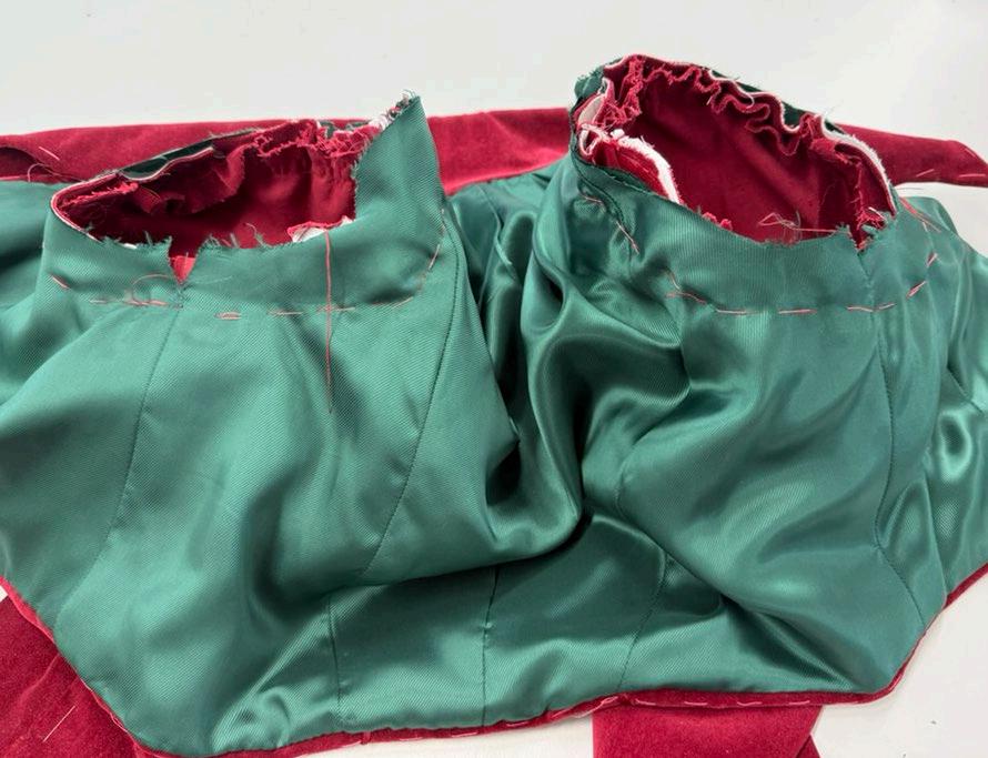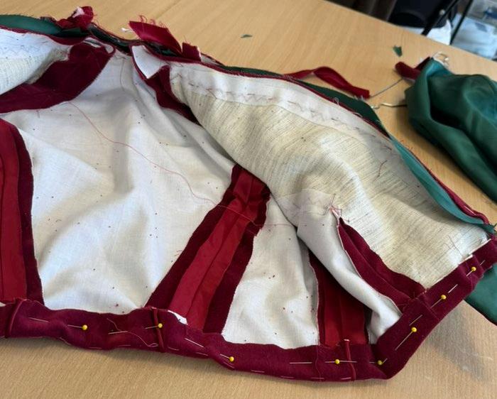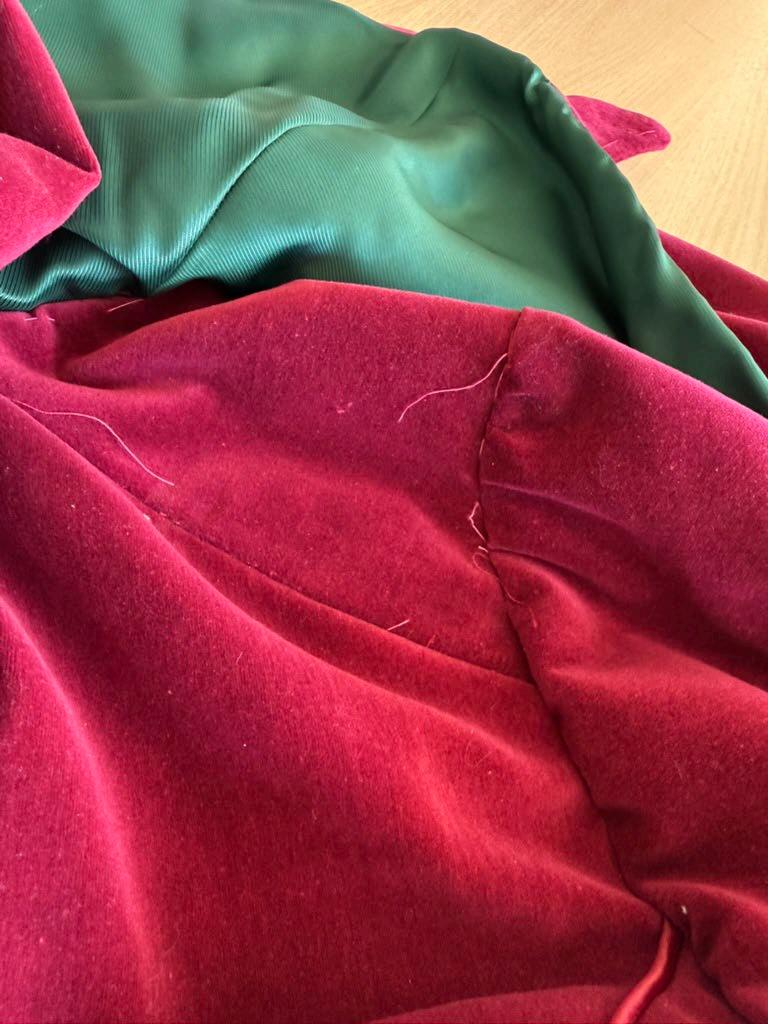 The cape’s lining was attached first, and this was done by bagging out the cape. The center front was left open so when the wrong sides were sewn together the jacket could be turned through. When pinning it was important to make sure the lines match up accurately for a good outcome.
