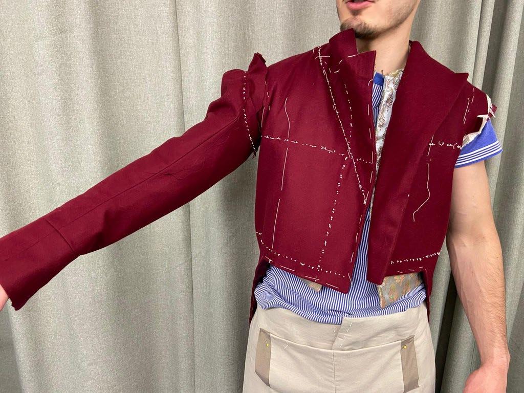 The sleeve lining was sewn together and gathered by the head of the sleeve, similar how the top fabric sleeve was sewn together. The armholes were mark tacked. This was so the design lines could be seen clearly and so that the lining and jacket were attached. The seam allowances were cut down to make putting the sleeve in easier.