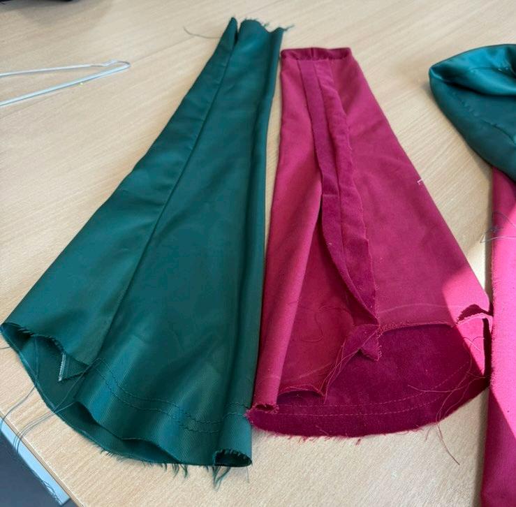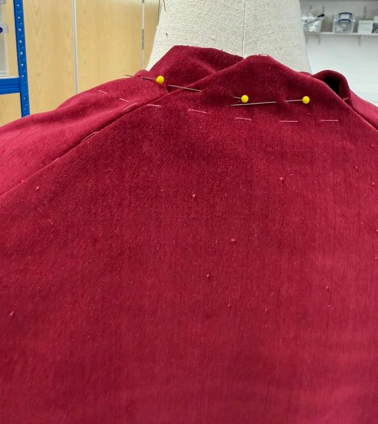 Around the edges of the collar were tacked diagonally, this was to create more room within the top collar compared to the under part. The collar was sewn and bagged out, leaving the bottom of the collar open. Same as the cape, the seam allowance needed to be cut down to create the wanted shape. Pinning the finished collar to the jacket to make sure everything sat right. This now gave a clear picture of how the collar would look sewn to the jacket.
