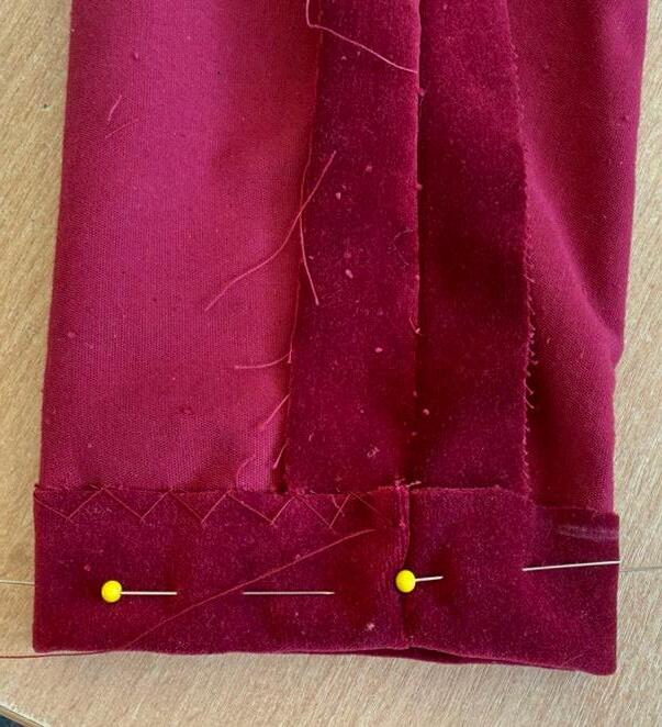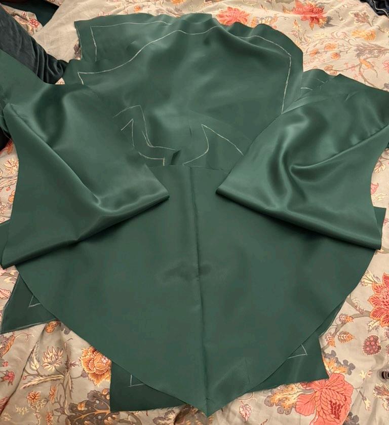 Before turning the cape through, the seam allowance needed to be cut down. Especially the pointed edges since the smaller the seam allowance more of the point can be pulled through, making it more defined. The cape was then ironed, and the center front was pinned closed.