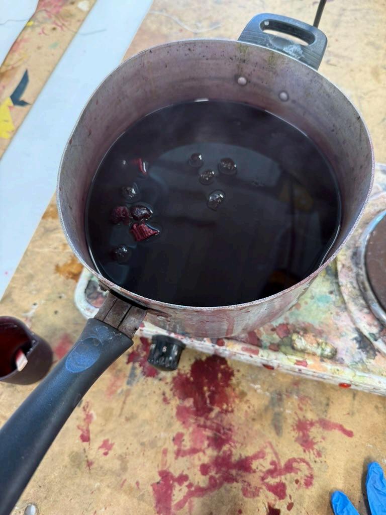 The pom pom trim was too pink so it was decided that the trim would be dyed. While dying the trim that Dorset buttons were sewn on.