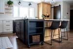 Rustic alder kitchen cabinets and boot bench, Montana maple cabinets in bathrooms