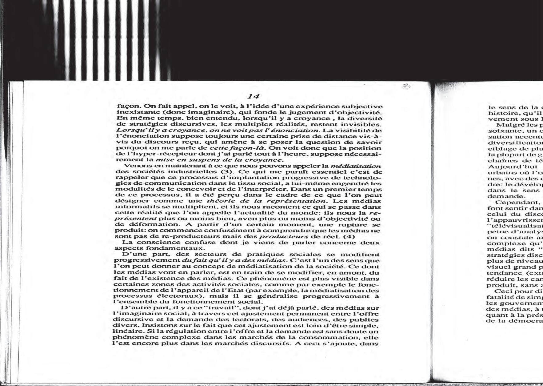 influït inicialment per l’estructuralisme de Claude Lévi-Strauss, amb qui va estudiar al Collège de France, Verón va impartir un seminari a Barcelona el 1990, convidat per la Societat Catalana de Comunicació. Aleshores era professor a la Sorbona després de liderar a Argentina recerques a l’Instituto Torcuato Di Tella, una icona de la confluència d’estructuralisme i marxisme. En aquest article del 1990 ja denunciava l’empobriment del discurs polític provocat per la «televisualització» del debat d’opinió i per l’emergència llavors incipient dels mitjans digitals.